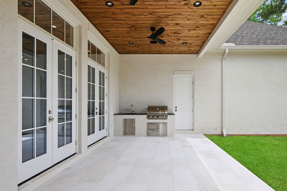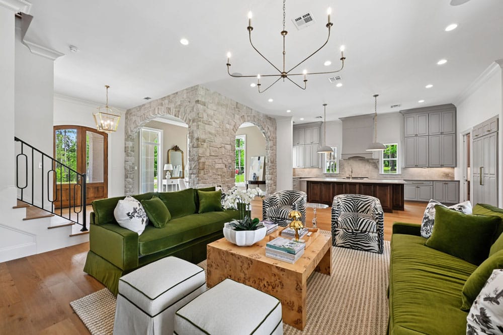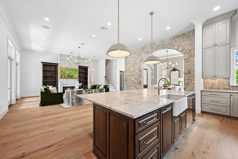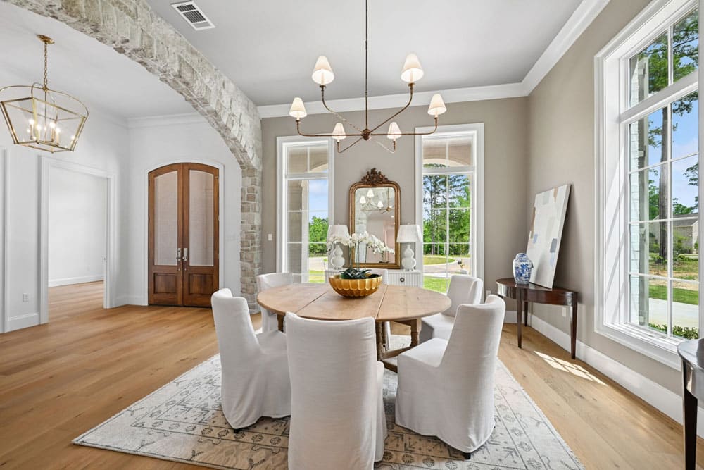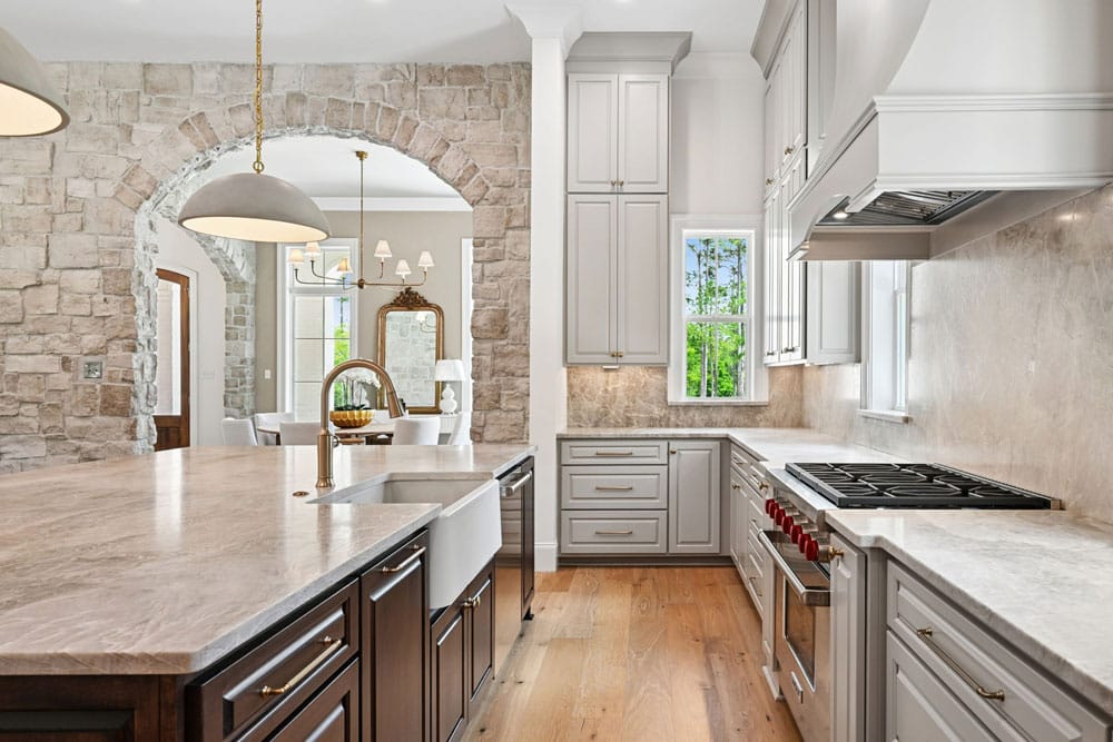 Inside, tall windows allow natural light to fill the space, highlighting clean lines, natural textures, and carefully selected finishes. Features like stone arched openings and custom cabinetry to the ceiling bring a balance of tradition and sophistication, creating a home that feels both elevated and inviting.